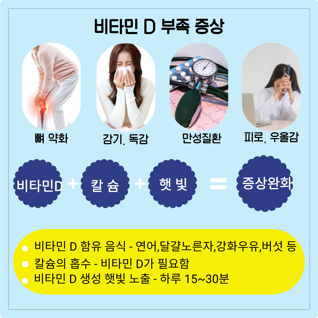 비타민 D는 지금 당장의 컨디션부터 미래의 건강까지 깊숙이 영향을 미치는 핵심 영양소입니다. 가볍게 넘겼던 피로감이나 잦은 감기, 우울감, 뼈 약화 같은 증상들이 사실은 비타민 D 결핍의 신호일 수 있다는 점, 이제는 놓치지 마세요. 당신의 일상 속 단 10분의 햇빛, 그리고 올바른 식단과 습관이 건강한 미래를 만드는 출발점이 될 수 있습니다. 지금 바로 오늘의 햇살을 맞으며 작은 노력으로 평생의 건강을 지켜보세요.
