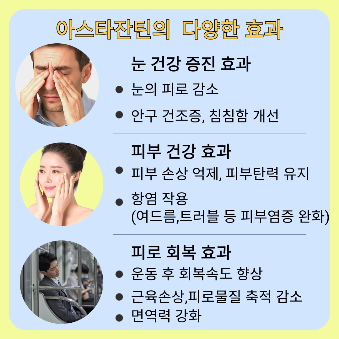 아스타잔틴은 염증을 억제하고 근육 내 활성산소를 제거하는 작용을 통해 운동 후 회복 속도를 빠르게 도와줍니다. 이는 운동 중 발생하는 근육 손상과 피로물질 축적을 줄여주는 데 큰 도움이 됩니다. 특히 유산소 운동이나 근력운동을 병행하는 사람들에게는 운동 지속 능력 향상과 지구력 증진에도 긍정적인 영향을 줍니다. 뿐만 아니라, 면역 세포의 활동을 조절해 면역력 강화에도 기여하며, 장기적인 건강 유지를 위한 항산화 보조제로 많은 주목을 받고 있습니다. 체내 염증 수치가 높은 현대인에게는 이러한 이중 효과가 특히 유용하게 작용하며, 일상 피로 해소와 체력 관리 측면에서도 아스타잔틴의 효능은 충분히 매력적입니다.