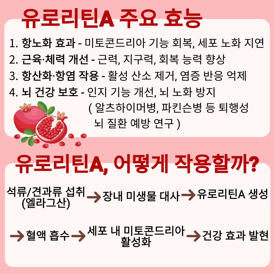 유로리틴A(Urolithin A)는 최근 전 세계적으로 주목받고 있는 항노화 성분입니다. 우리가 섭취하는 석류, 호두, 딸기, 라즈베리, 블랙베리 같은 과일과 견과류에는 '엘라그산(Ellagic acid)'과 '엘라지타닌(Ellagitannin)'이라는 성분이 풍부하게 들어 있는데요. 이 성분들이 우리 몸속 장내 미생물에 의해 대사 되면서 유로리틴A라는 새로운 물질이 만들어집니다. 다시 말해, 유로리틴A는 음식을 통해 바로 섭취되는 것이 아니라 장내 세균이 만들어내는 대사산물인 것입니다. 하지만 모든 사람이 유로리틴A를 충분히 생성할 수 있는 것은 아닙니다. 장내 세균의 구성은 사람마다 다르기 때문에, 같은 양의 석류를 먹더라도 어떤 사람은 충분히 생성하지만, 어떤 사람은 거의 만들어내지 못하기도 합니다. 연구에 따르면 인구의 약 30~40% 정도만이 효과적으로 유로리틴A를 생산할 수 있다고 알려져 있습니다. 이런 이유 때문에 최근에는 직접 합성된 유로리틴A 보충제가 개발되어, 누구나 안정적으로 섭취할 수 있는 방법이 주목받고 있습니다. 유로리틴A가 주목받는 가장 큰 이유는 단순한 항산화 효과가 아니라, 세포의 에너지 공장인 미토콘드리아의 기능을 회복시키는 특별한 능력을 가지고 있기 때문입니다.